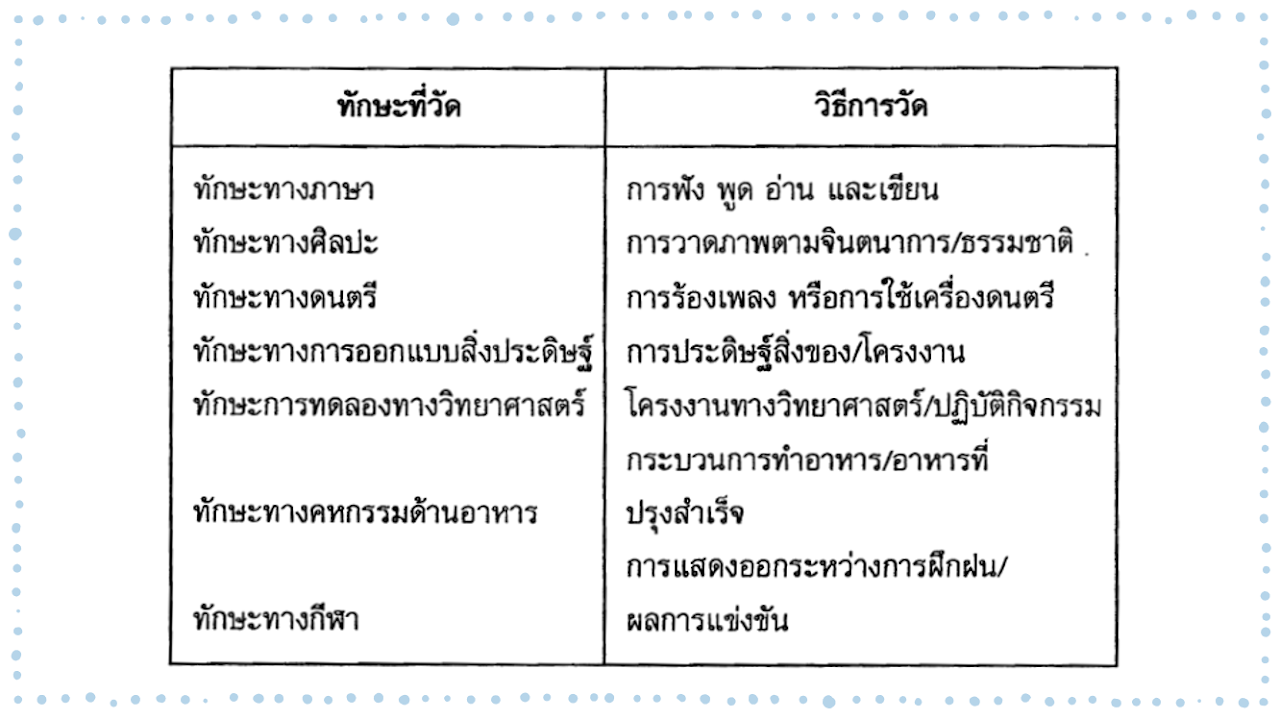 | การวัด (เครื่องมือ) | เช่น แบบสังเกตพฤติกรรม แบบทดสอบ ใบงาน | ||